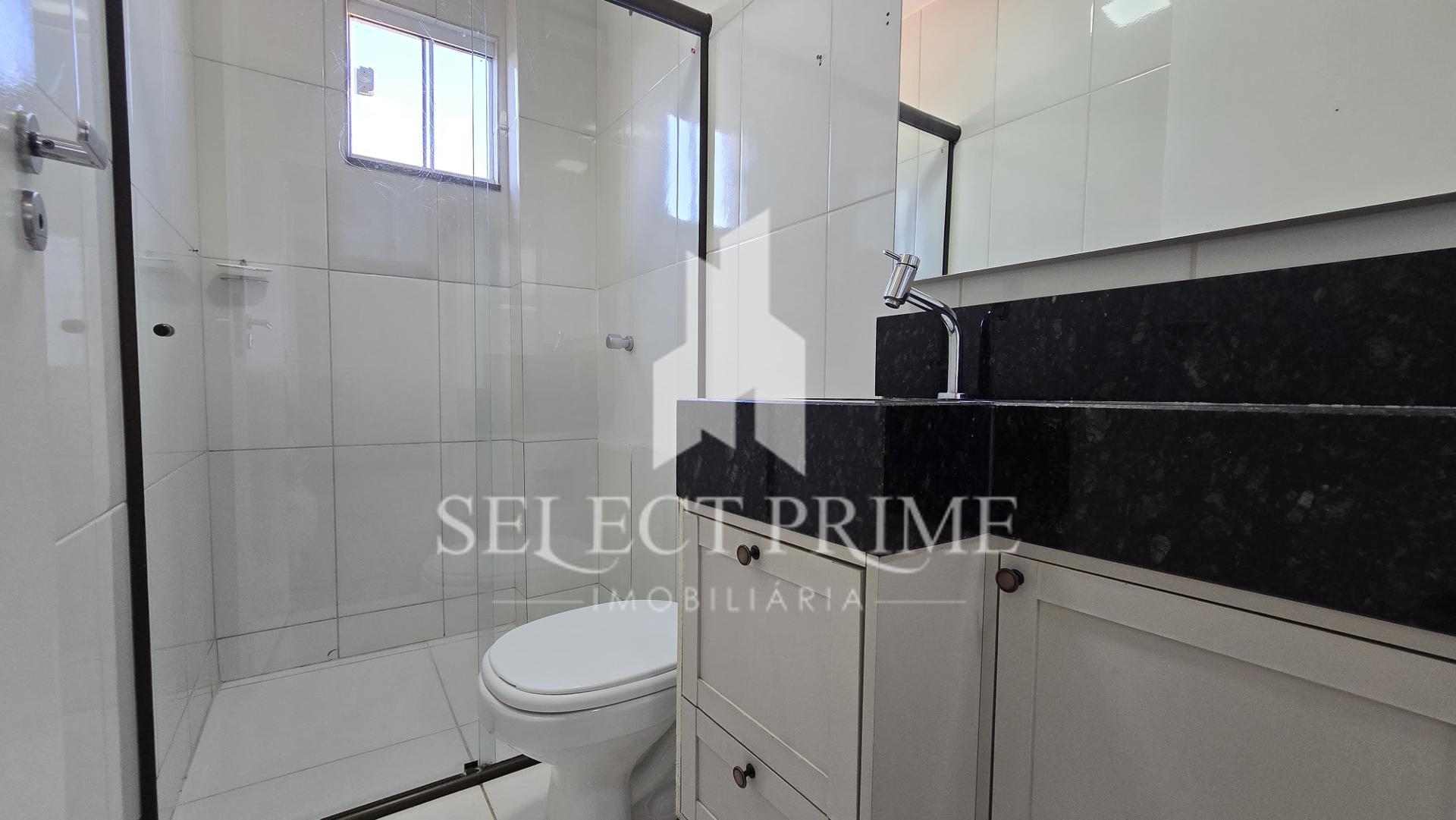 Banhei com bancada, box de vidro e acabamento em cerâmica