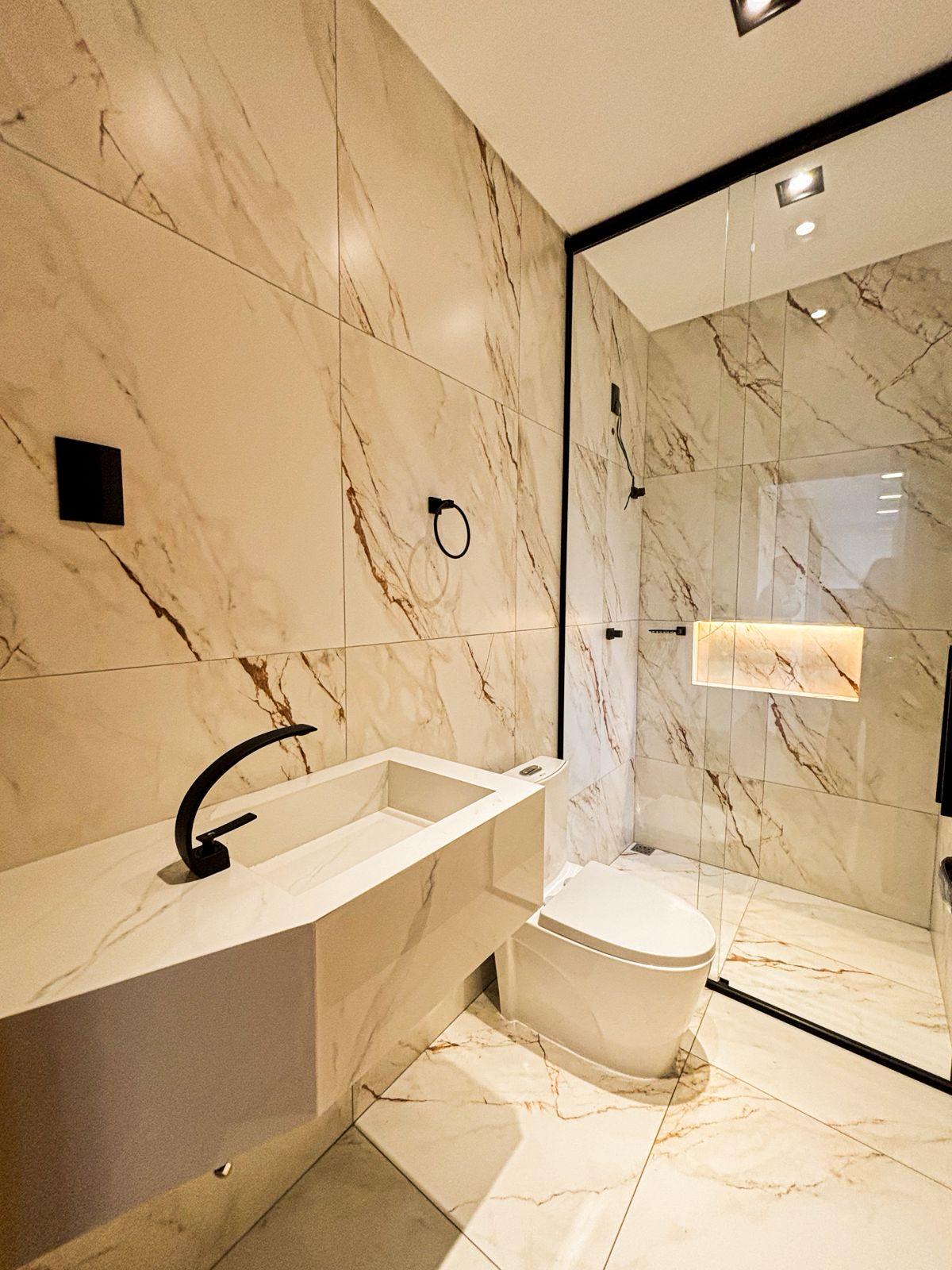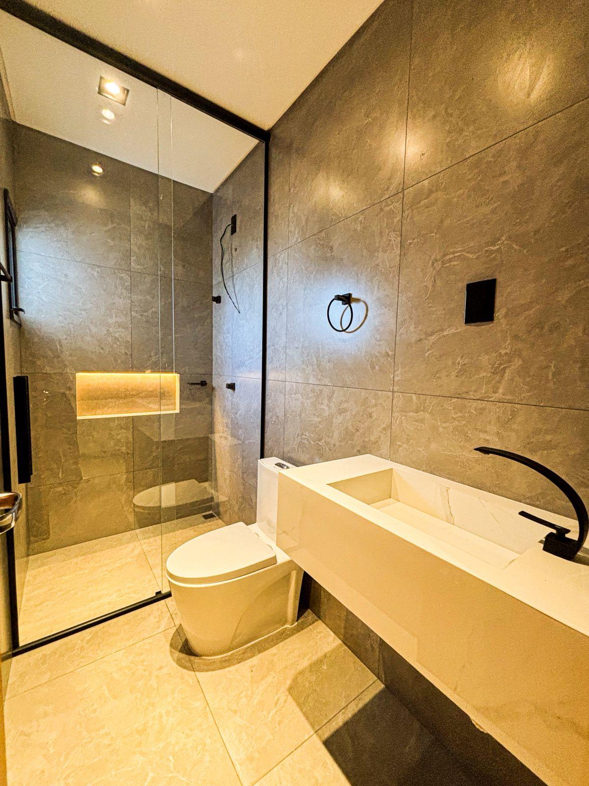 * BANHEIRO SOCIAL COM BOX ATÉ O TETO QUE TRAZ UM TOQUE REFINADO PARA SEUS MOMENTOS PRIVATIVOS